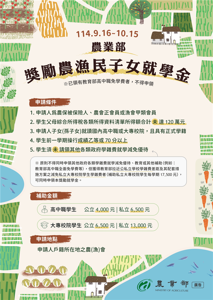 農業部獎勵農漁民子女就學金申請表(114學年度第1學期)申請文件下載